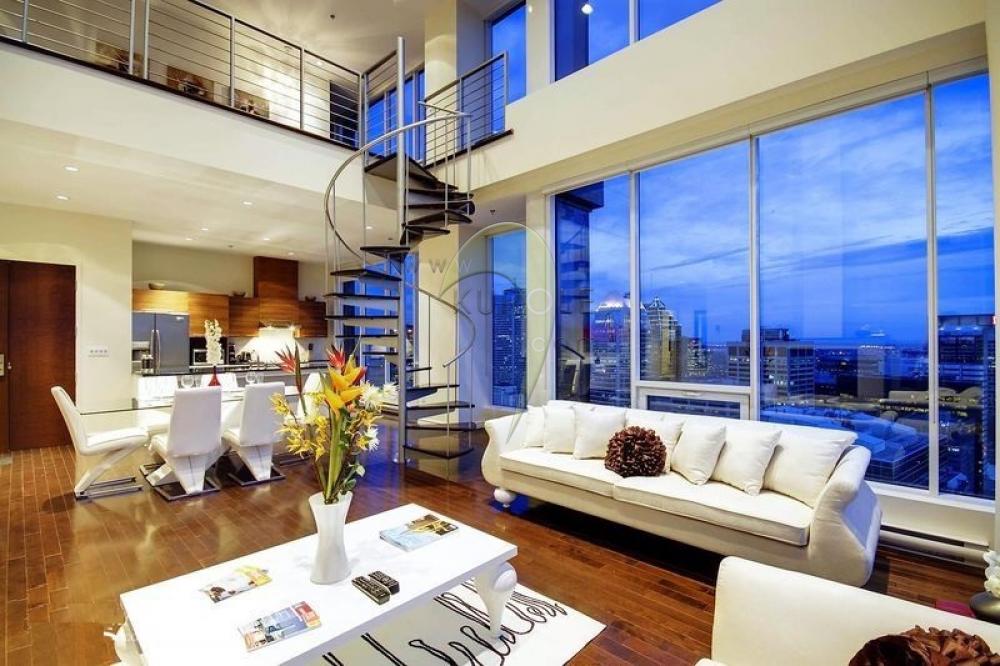 Sala de estar ampla com sofás, janelas grandes e uma escada para o segundo andar.